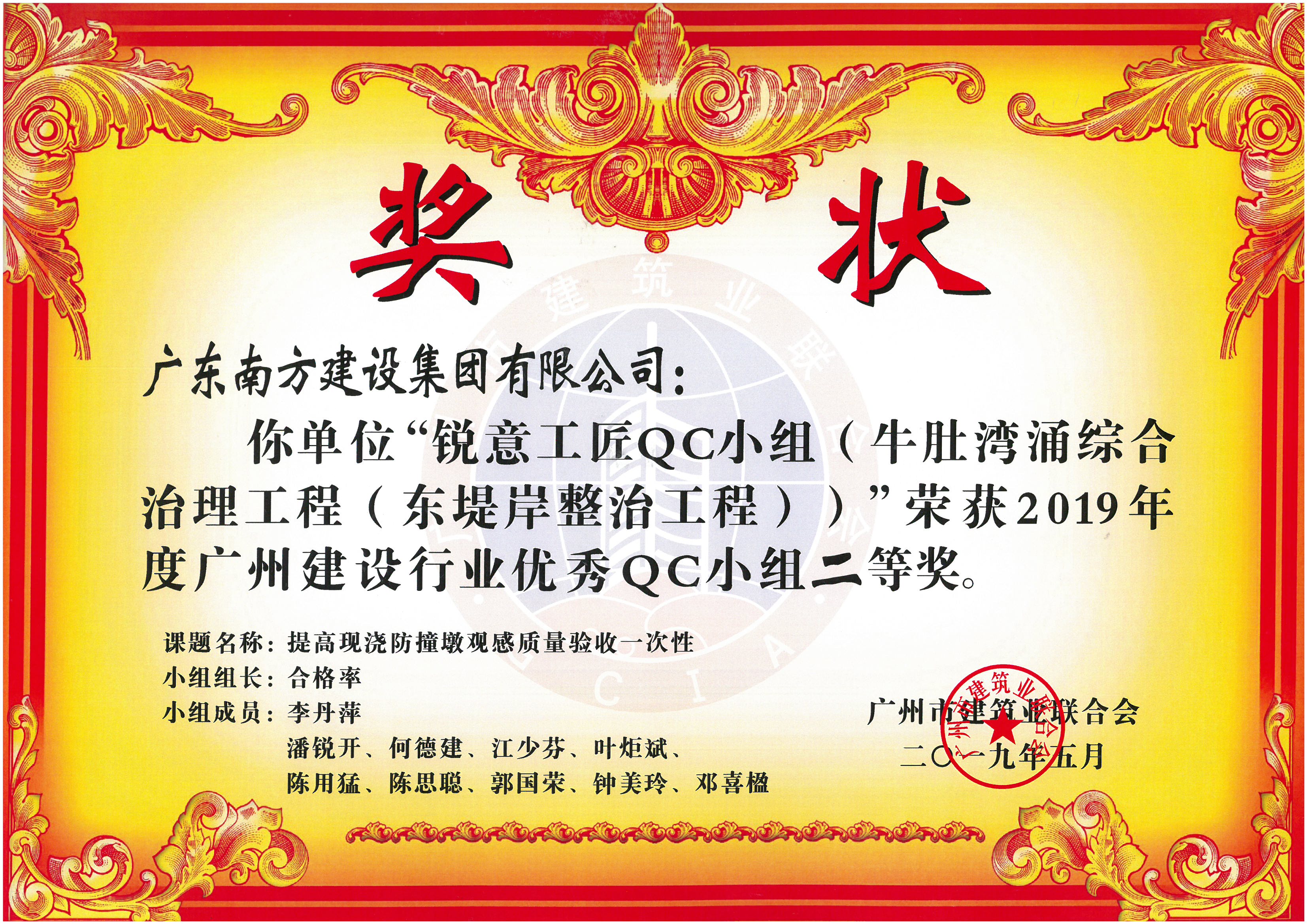 2019年度廣州建設(shè)行業(yè)優(yōu)秀QC小組二等獎(jiǎng)(牛肚灣涌綜合治理工程(東堤岸整治工程)