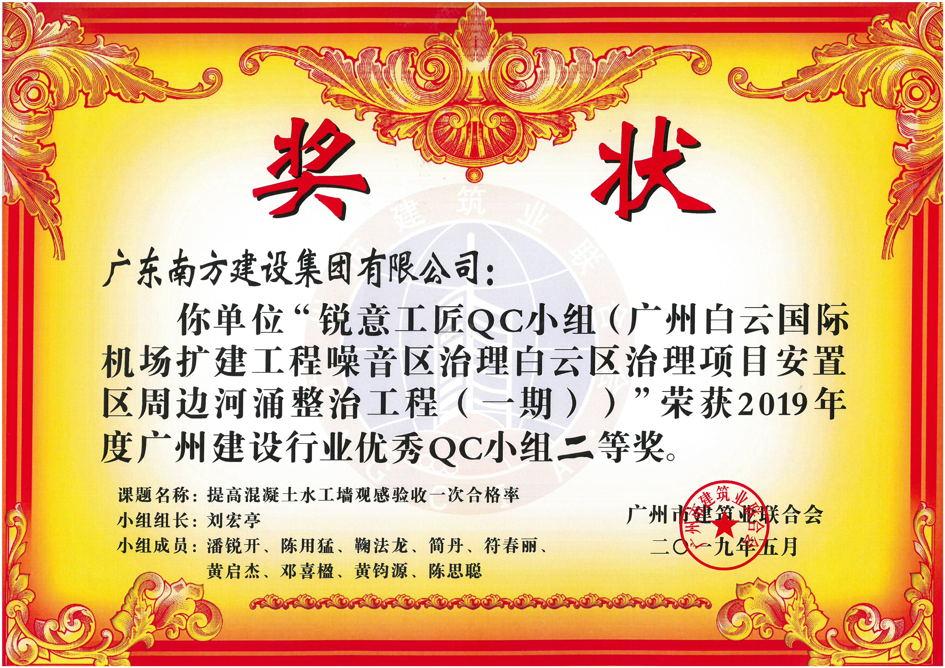 2019年度廣州建設(shè)行業(yè)優(yōu)秀QC小組二等獎(jiǎng)(廣州白云國際機(jī)場(chǎng)擴(kuò)建工程噪音區(qū)治理白云區(qū)治理項(xiàng)目安置區(qū)周邊河涌整治工程