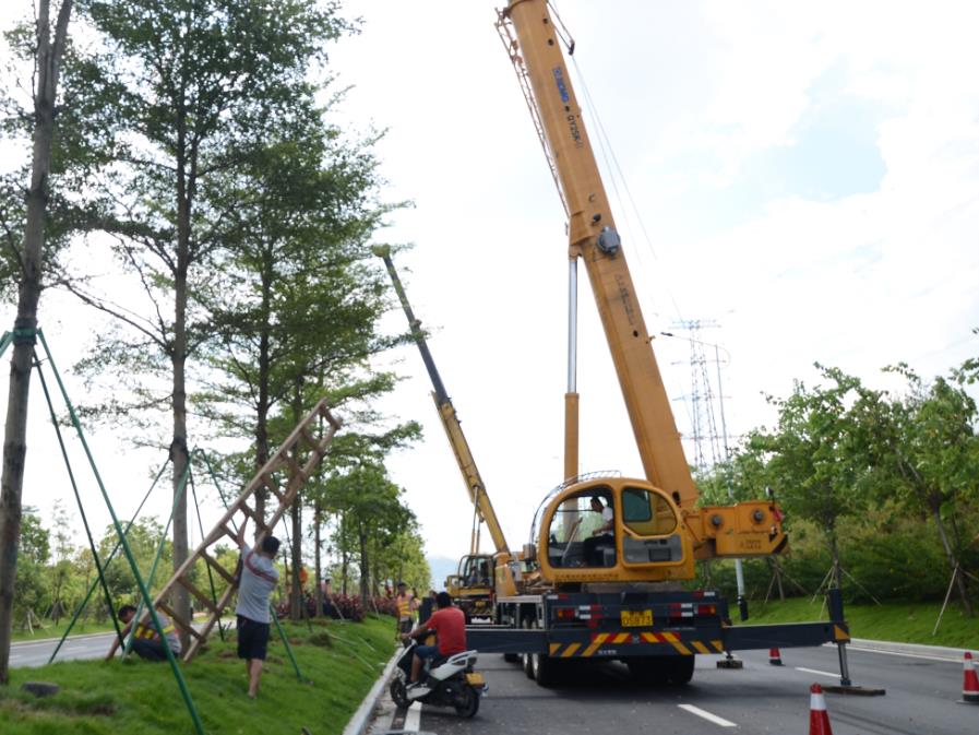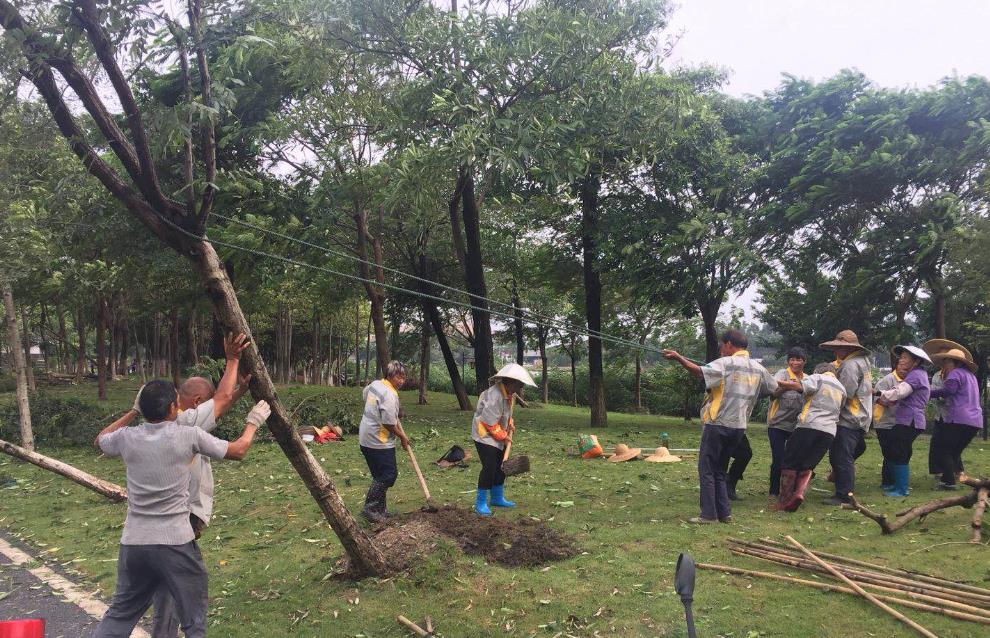 增城區(qū)創(chuàng)譽(yù)路建成通車不久,此次臺(tái)風(fēng)導(dǎo)致大量新植樹木被連根拔起。為提高被臺(tái)風(fēng)吹倒的樹木的存活率,搶修人員與時(shí)間賽跑,不辭辛勞,連夜作戰(zhàn),在盡可能短的時(shí)間內(nèi)將綠化樹木剪枝、扶正,最大限度保證成活率。
